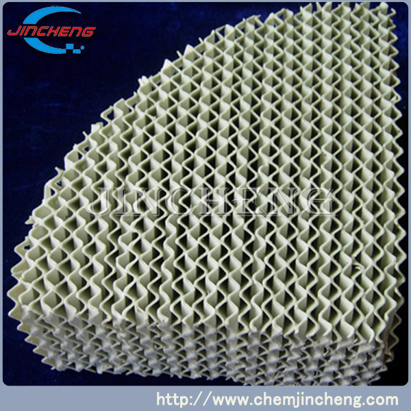Керамическая составленная упаковка состоит из много пакуя блоков подобного геометрического дизайна. Рифленые листы установили параллельно formcylindrical вызванные блоки рифленой упаковкой башни. Эти форма сильно эффективной упаковки с отделять эффективность несколько времен более высоко чем эта из свободной упаковки. Они имеют качество падения низкого давления, увеличенной работая упругости, минимального усиливаясь влияния, и максимальной жидкостной обработки сравненной для того чтобы освободить упаковку башни.